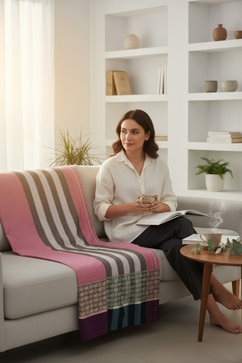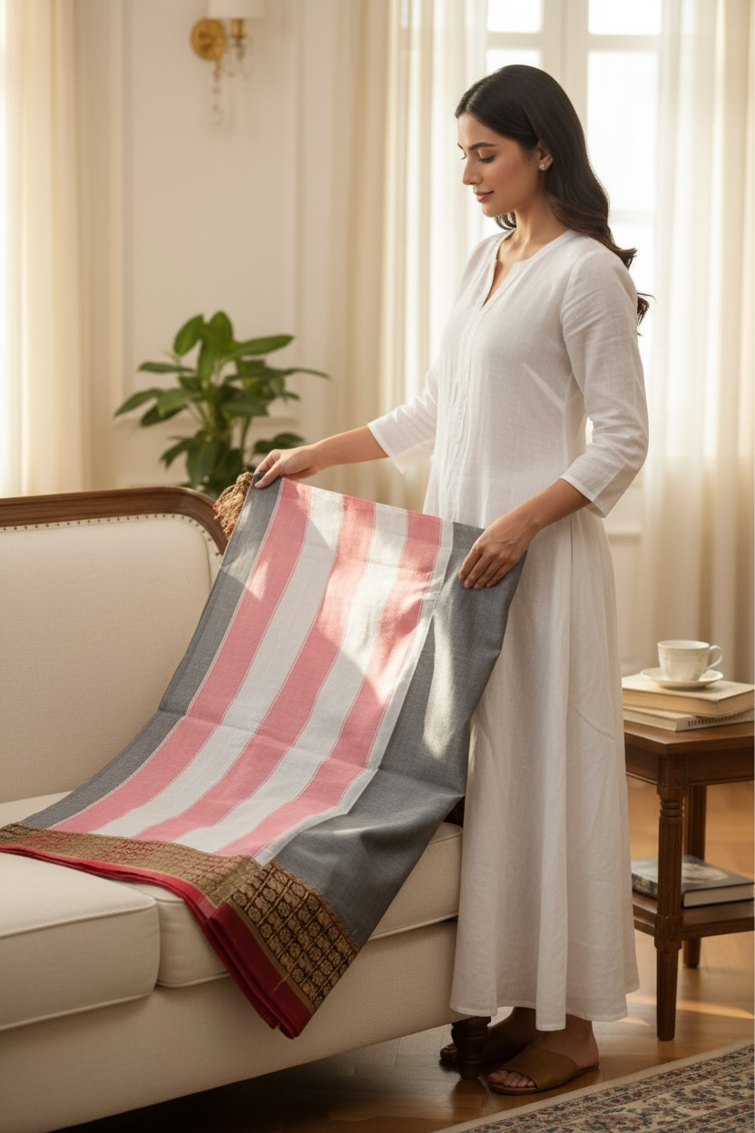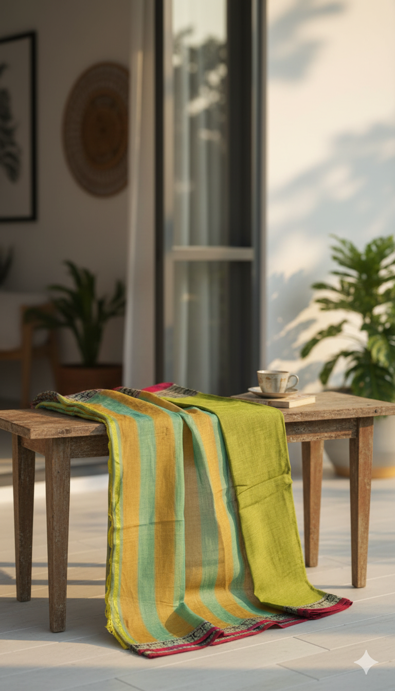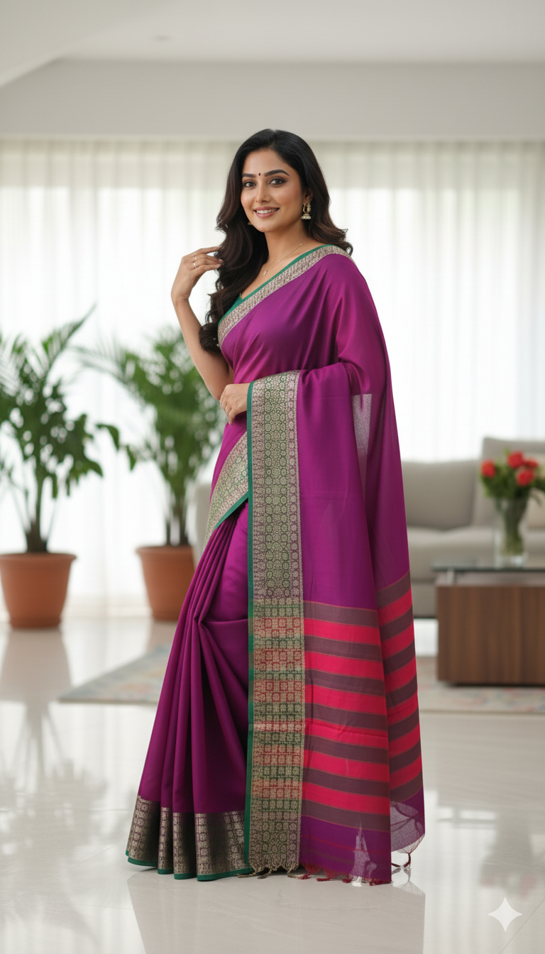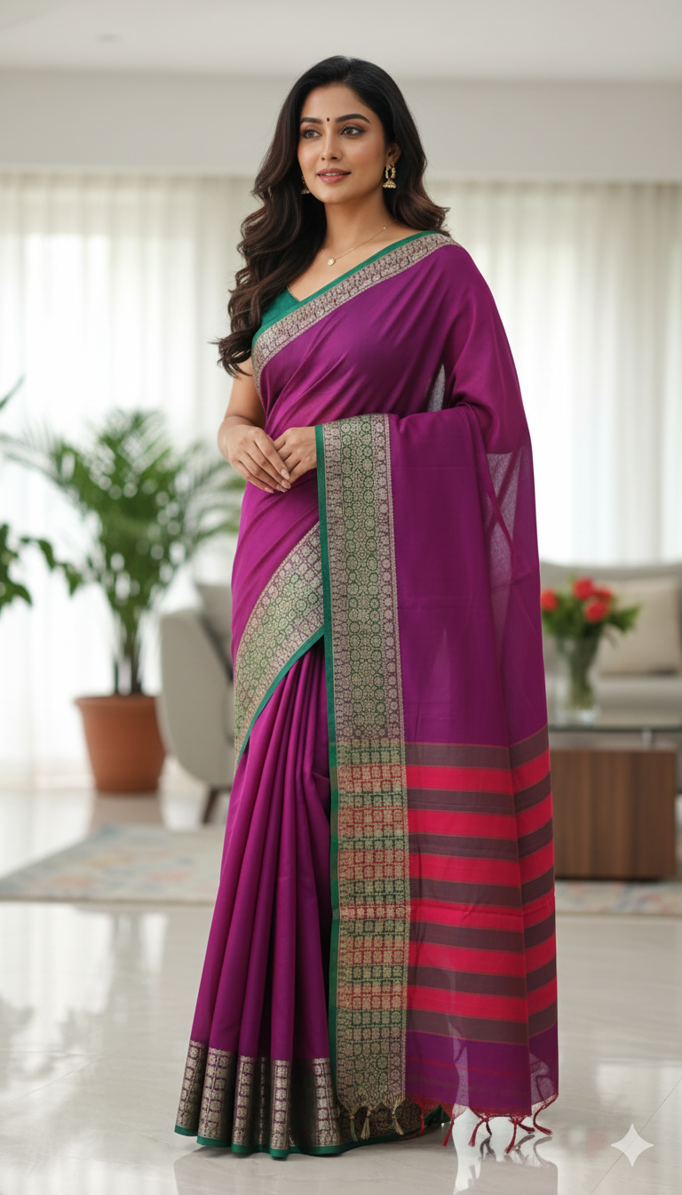 Vivid contrasts and bold borders define this Ilkal Narayanpet Contrast saree, crafted for women who love colours that celebrate them.