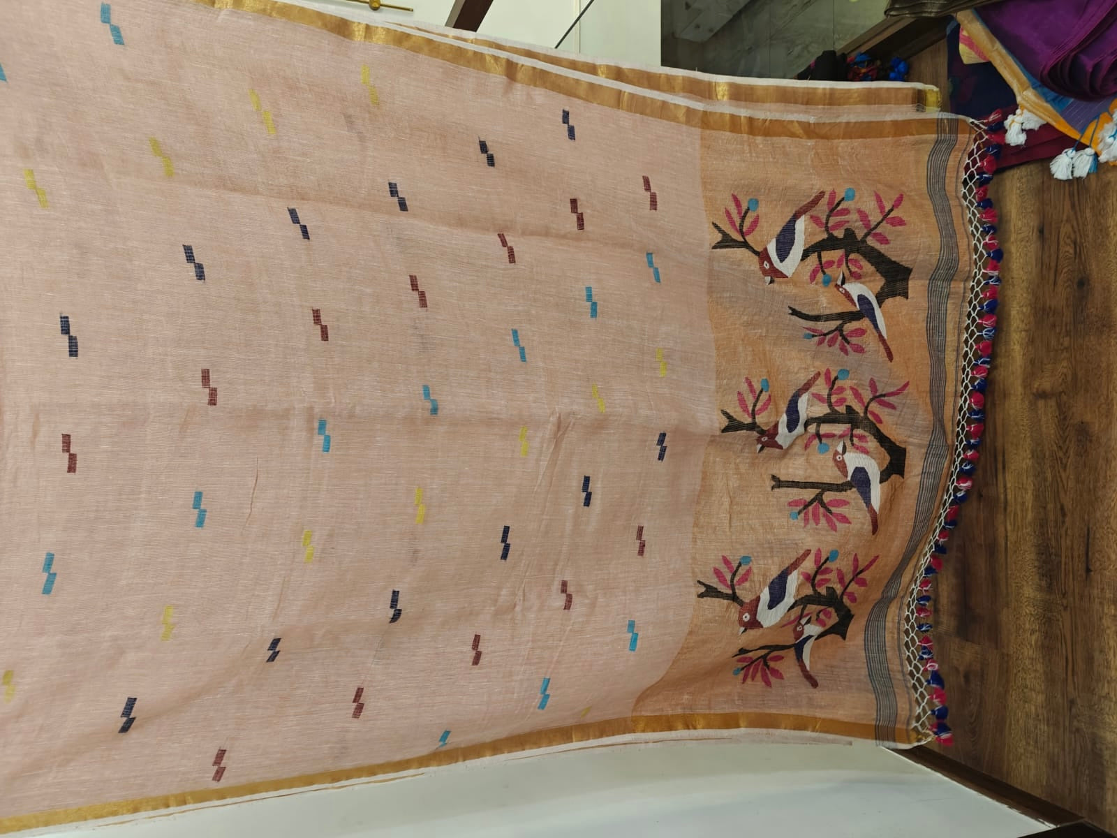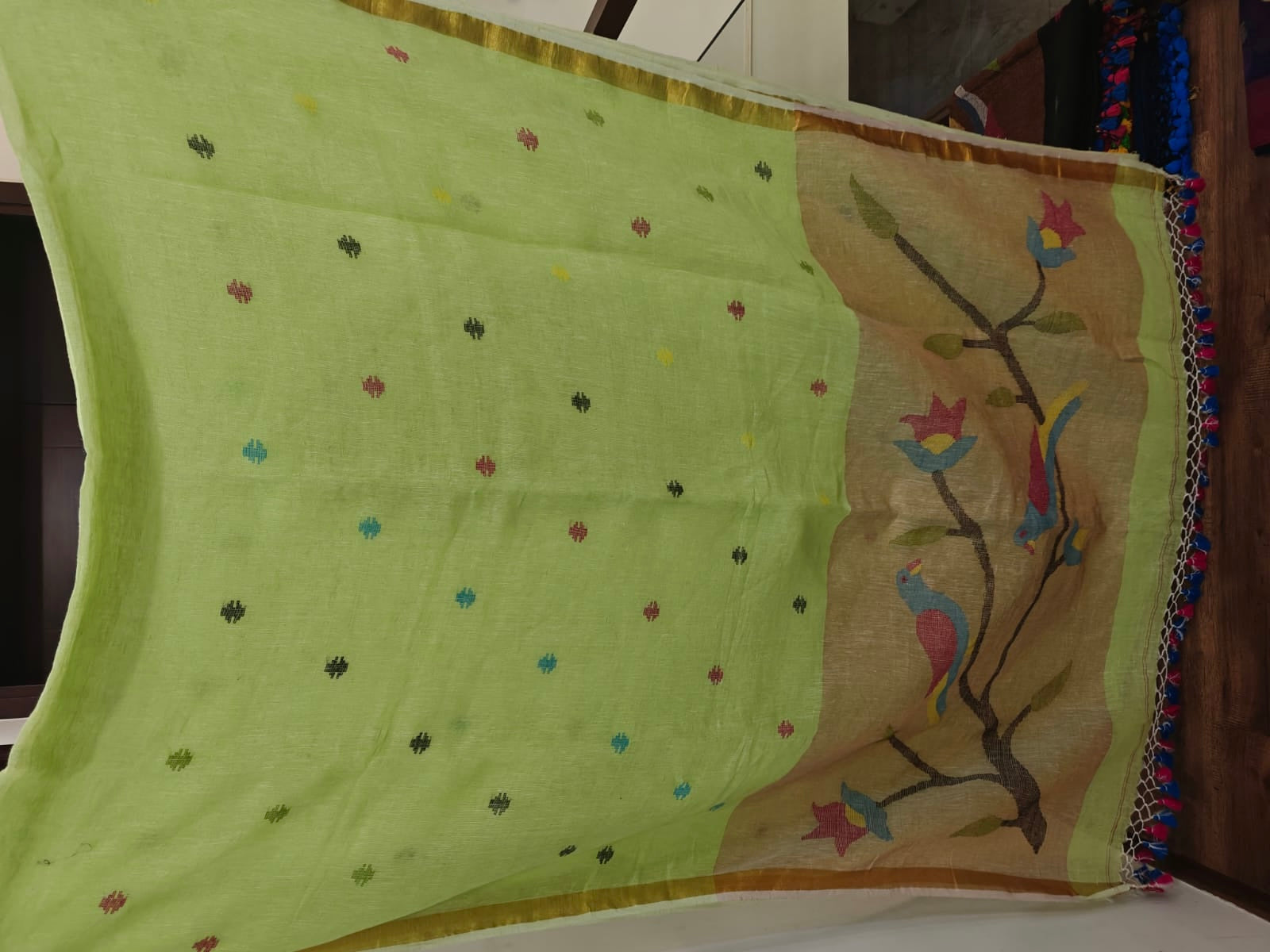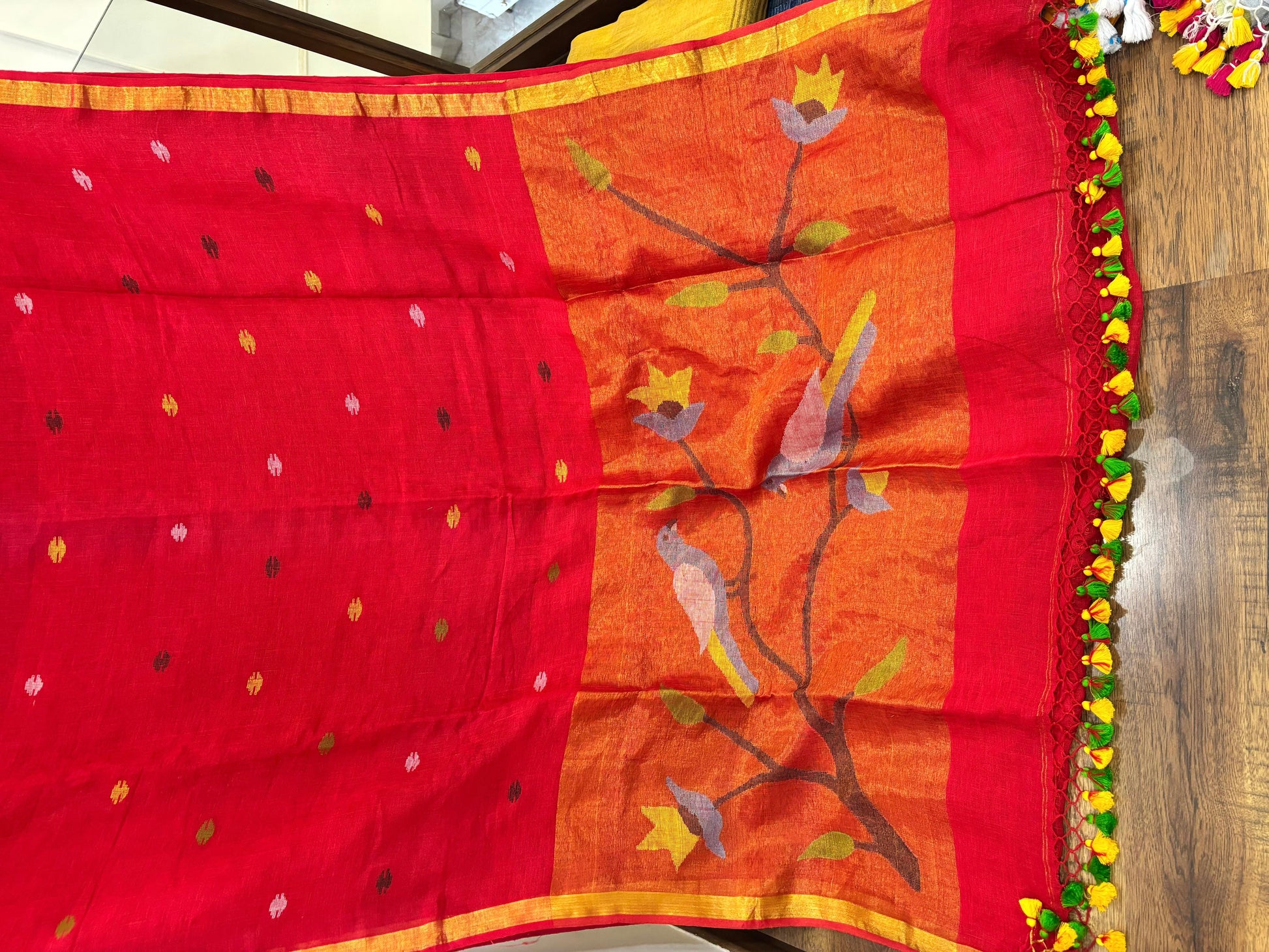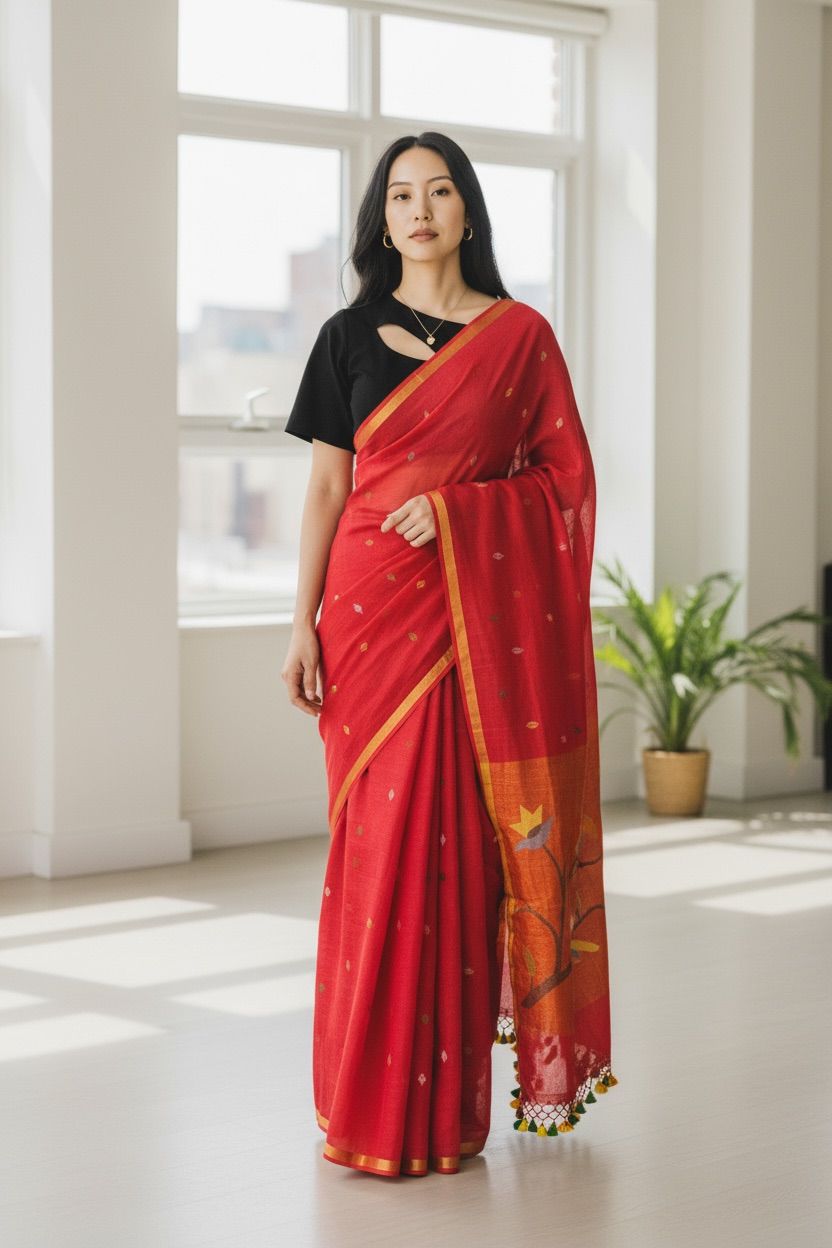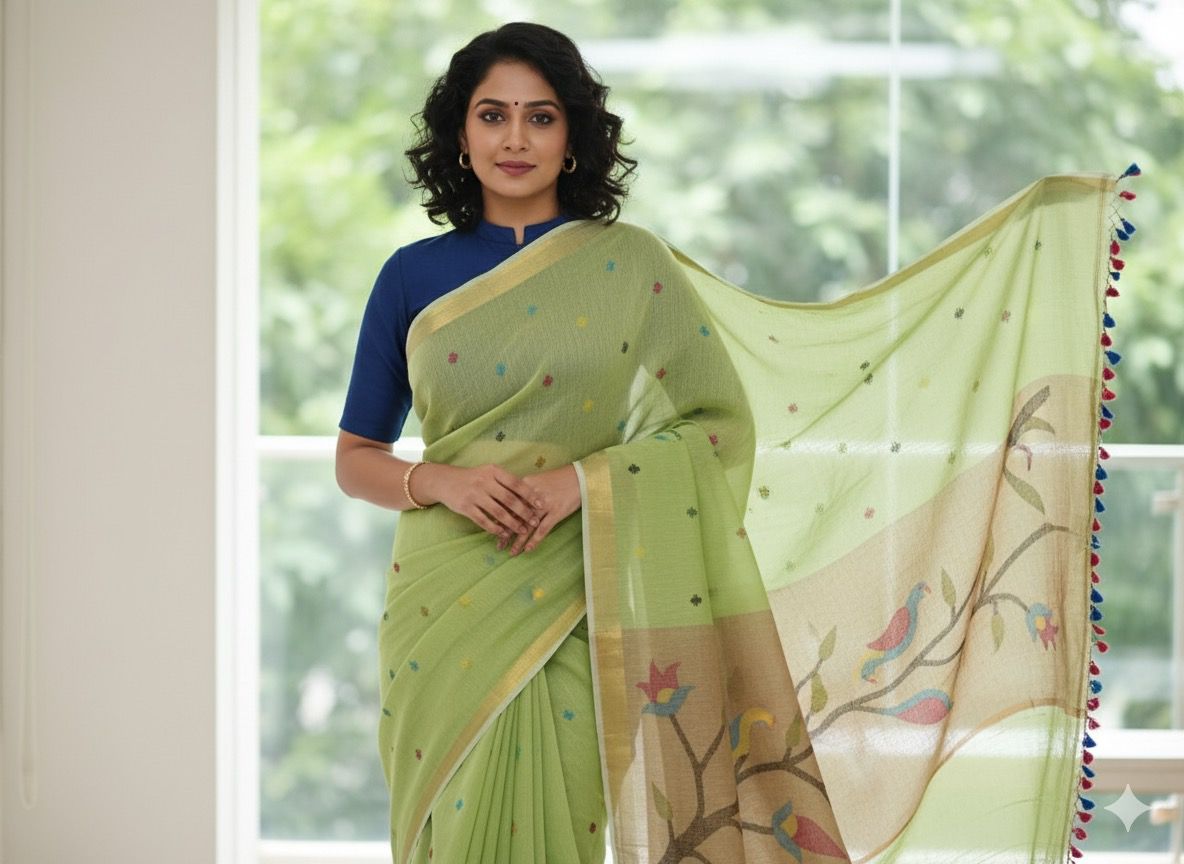 Unique Fusion Weave – Combines Jamdani’s airy texture with Paithani’s regal charm.
