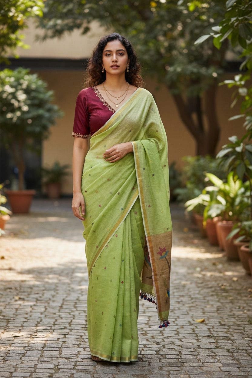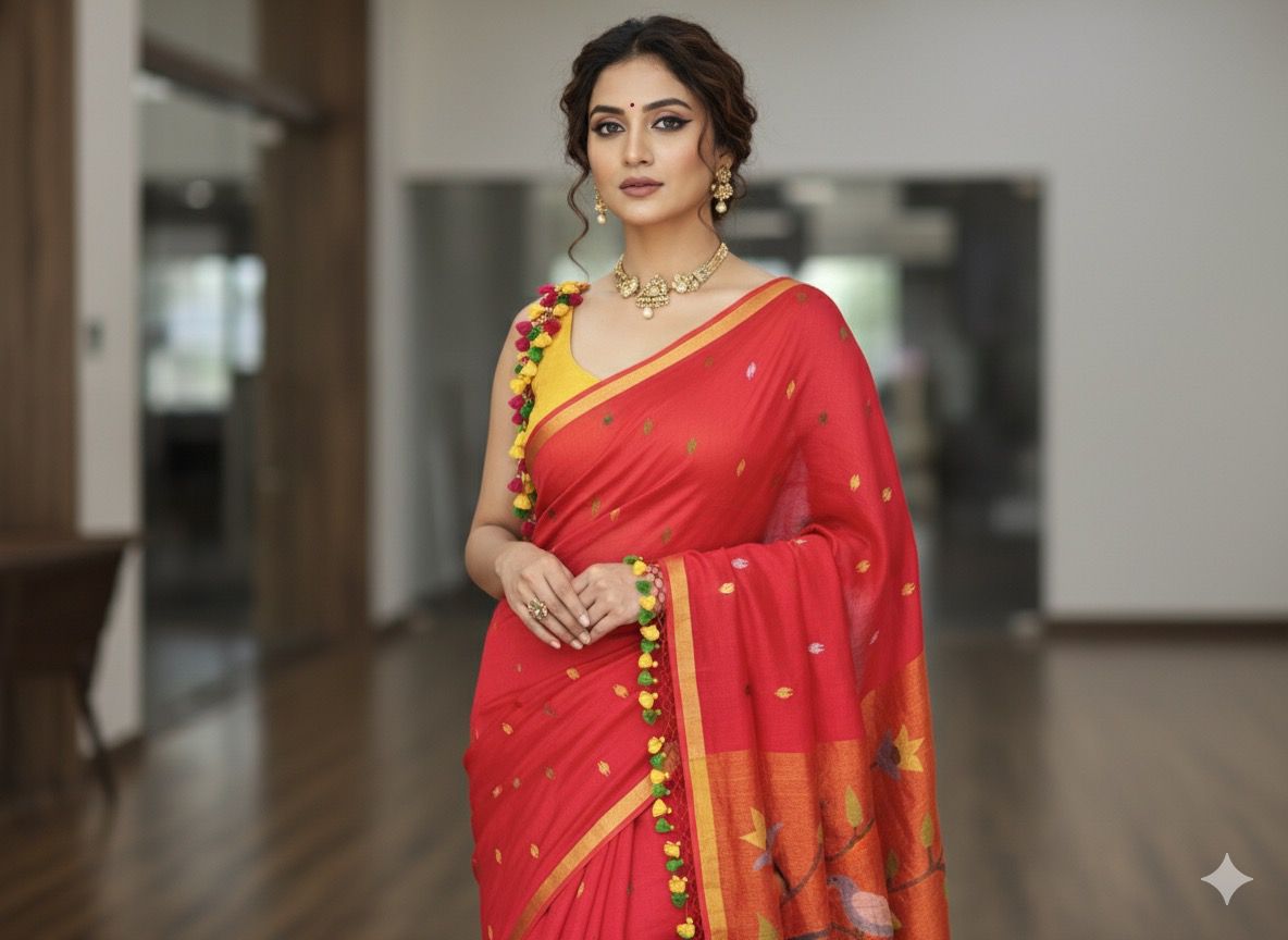 Handwoven Detailing – Each saree reflects the patience and skill of traditional artisans.