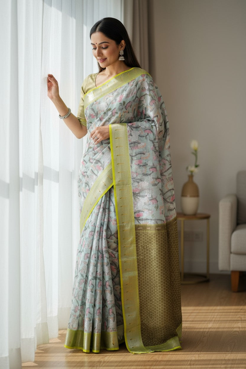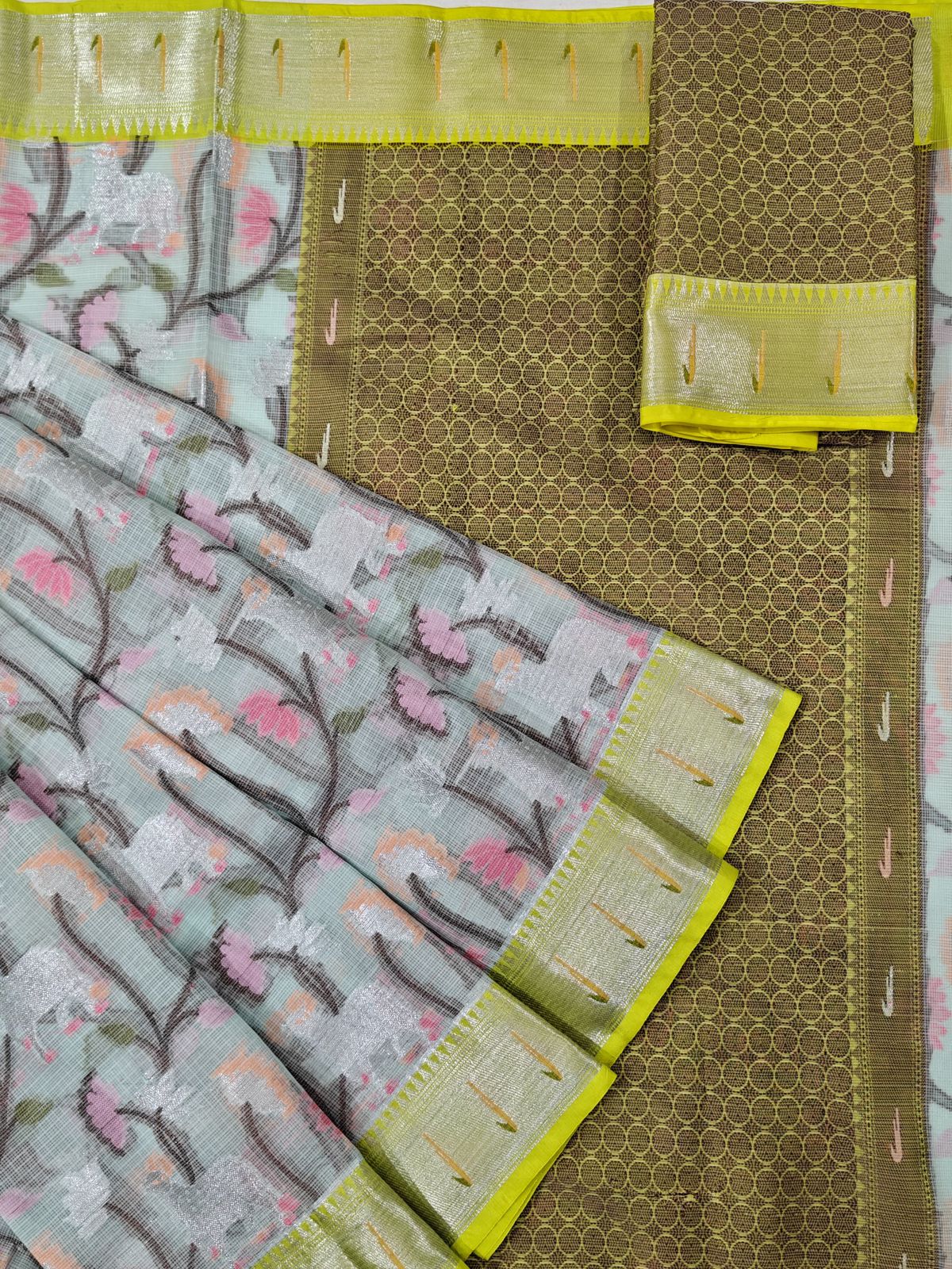 The Kota Muniya Border Saree is a graceful reflection of timeless Indian artistry. Woven from soft Kota fabric, it carries a delicate, airy feel that drapes beautifully with every move. The signature Muniya border, adorned with tiny bird motifs, adds a charming traditional touch - celebrating simplicity, culture, and femininity in the most elegant way.